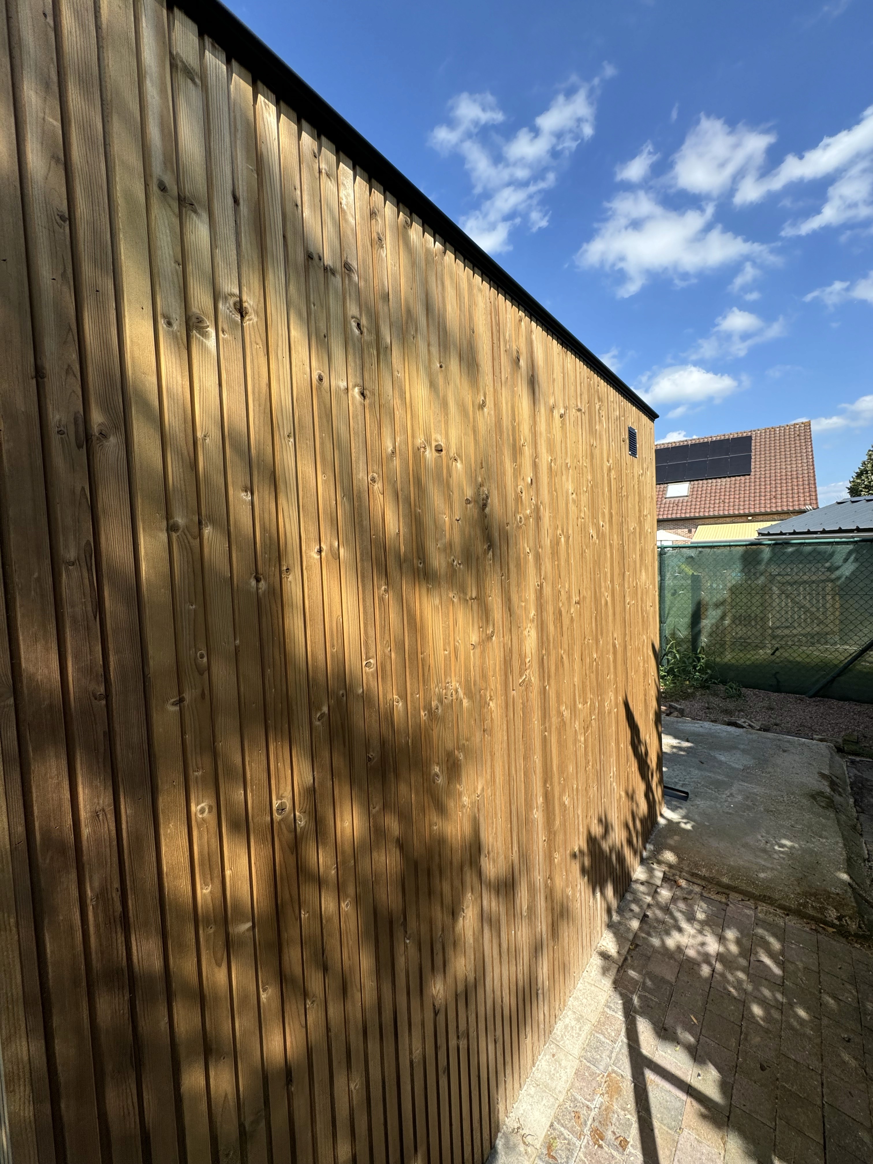 Dit modern tuinhuis is op maat afgewerkt met triple thermo grenen planchetten. De natuurlijke uitstraling en weersbestendige afwerking maken het duurzaam en onderhoudsvriendelijk. Interesse in een houten tuinhuis op maat?